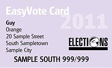Voters are encouraged to bring with them the EasyVote card sent to them before each election, which specifies the voter's name, address, and position on the electoral roll (e.g. Christchurch East 338/23 means the voter is listed in the Christchurch East electorate roll, on line 23 of page 338). However, this is not required, voters may simply state their name and address to the official.