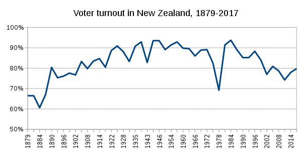 As shown in the table above, voter turnout has generally declined in New Zealand general elections since the mid-20th century. Concerns about declining democratic engagement and participation have been raised by the Electoral Commission, and by commentators such as Sir Geoffrey Palmer and Andrew Butler, leading some to support the introduction of compulsory voting, as exists in Australia. A system of compulsory voting looks unlikely to manifest in the near future with Prime Minister Jacinda Ardern arguing that it is an ineffective way to foster citizen engagement.[34]