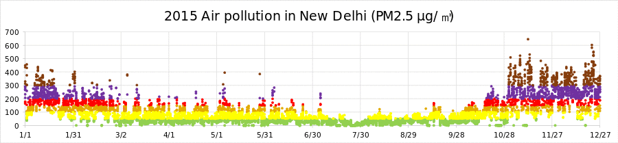 On 5 November 2020, New Delhi recorded its most toxic day in a year, as the concentration of poisonous PM2.5 particles was recorded at 14 times the WHO's safe limit.[67]