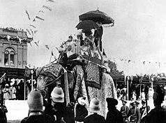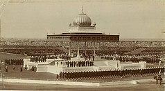 During the Delhi Durbar on 12 December 1911, George V, then Emperor of India, along with Queen Mary, his consort, made the announcement[11][12] that the capital of the Raj was to be shifted from Calcutta to Delhi, while laying the foundation stone for the viceroy's residence in the Coronation Park, Kingsway Camp.[13][14] The foundation stone of New Delhi was laid by King George V and Queen Mary at the site of Delhi Durbar of 1911 at Kingsway Camp on 15 December 1911,[15] during their imperial visit. Large parts of New Delhi were planned by Edwin Lutyens, who first visited Delhi in 1912, and Herbert Baker, both leading 20th-century British architects.[16] The contract was given to Sobha Singh. The original plan called for its construction in Tughlaqabad, inside the Tughlaqabad Fort, but this was given up because of the Delhi-Calcutta trunk line that passed through the fort. Construction really began after World War I and was completed by 1931. The gardening and planning of plantations was led by A.E.P. Griessen, and later William Mustoe.[17] The city that was later dubbed "Lutyens' Delhi" was inaugurated in ceremonies beginning on 10 February 1931 by Lord Irwin, the Viceroy.[18] Lutyens designed the central administrative area of the city as a testament to Britain's imperial aspirations.[19][20]