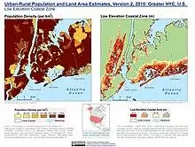 According to the United States Census Bureau, the city had a total area of 25.89 square miles (67.04 km2), including 24.14 square miles (62.53 km2) of land and 1.74 square miles (4.51 km2) of water (6.72%).[2][3] It has the third-smallest land area among the 100 most populous cities in the U.S., behind neighboring Jersey City and Hialeah, Florida.[46] The city's altitude ranges from 0 (sea level) in the east to approximately 230 feet (70 m) above sea level in the western section of the city.[47][48] Newark is essentially a large basin sloping towards the Passaic River, with a few valleys formed by meandering streams. Historically, Newark's high places have been its wealthier neighborhoods. In the 19th century and early 20th century, the wealthy congregated on the ridges of Forest Hill, High Street, and Weequahic.[49]