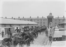 The origin of the modern town lies in the establishment of Cavalry Barracks (1815–1819) on land purchased from three local landlords: Eyre Powell of Great Connell, Ponsonby Moore of Moorefield and William Hannon of Kilbelin.[4] This barracks originally extended from the River Liffey to Cutlery Road, and from Main Street to Military Road, however little of the barracks remains today except the old walls and gateways which can be found on the Athgarvan Road, and to a lesser degree on Cutlery Road. The "Watering Gates" located at the entrance to the Town Park was also constructed as part of the original Barrack building (and as the name suggests this "gate" was used to facilitate access to the river for the horses from the barracks). At the same time, Eyre Powell gave land north of the new high road for building houses and shops to serve the new Barracks. Main Street took shape at the same time as the Barracks were being built. From 1819 various Cavalry Regiments were stationed at Newbridge and brought much business to the town.[4]