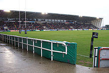 Newcastle Falcons play at Kingston Park which holds 10,250.[2] Kingston Park was the second smallest stadium in the Premiership Rugby with the club's average attendance currently sitting at approximately 10,000, a 42.5% increase from the 2016/17 season and a 96.8% increase from the 2013/14 season. The stadium has three modern stands; the open air North standing Terrace, the enclosed South Stand Terrace – where the loudest fans traditionally stand and sing, and the all-seated West Stand. However, the Falcons also retain the original Gosforth East stand complete with green and white seating (Gosforth colours). The pitch at Kingston Park recently went under renovation, replacing the former grass surface with a 3G Synthetic pitch with the aim of reducing the matches lost to the North East weather.[16] In June 2015, the Falcons bought Kingston Park back from Northumbria University, which was a bold statement by the club ahead of the 2015–16 season.