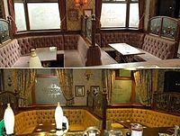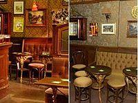 Originally, the pub was divided into three separate bars: the public bar, the snug (usually inhabited by unaccompanied ladies, where drinks were half a penny cheaper) and the select (where drinks were more expensive but were served by a waitress).[3] As late as 1960, the ruling in the pub was that ladies were not allowed to remain at the bar after being served. These archaic rules were dropped soon afterwards. When the pub was damaged by an accidental fire in 1986, the three bars were knocked into one large room.