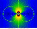 The "Julia" variant of the Nova fractal keeps constant over the image and initializes to the pixel coordinates. The "Mandelbrot" variant of the Nova fractal initializes to the pixel coordinates and sets to a critical point, where .[5] Commonly-used polynomials like or lead to a critical point at .