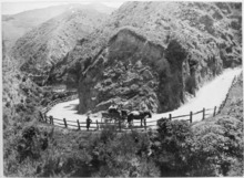 The road up the gorge was transformed between July 1938 and November 1939 as an extra part of the Wellington to Paekakariki project later dubbed the Centennial Highway. In June 1938 Bob Semple, Minister of Works, announced the administration of Ngahauranga Gorge would leave Wellington City and Suburban Highways Board and join the new system of State Highways. He said "Motoring mishaps, some more serious than others, are not uncommon, due principally to the tortuous nature of this road and the density of traffic which amounts to between 3000 and 4000 vehicles per day. . . . Briefly the intention is to completely re-align and re-grade the road through the Ngahauranga Gorge so as ultimately to provide for four lanes of traffic."[3] On commencement of the project the new Minister "symbolised the new administration's optimism and the power of machinery over the picks and shovels by getting into a bulldozer and wrecking a pile of wheelbarrows".[4] The Ngauranga Gorge four-lane highway was officially opened on 4 November 1939.[note 3] [5]