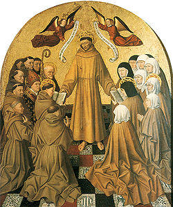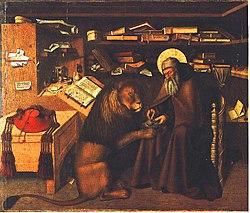 His main surviving works are two large altarpieces, the first executed in oil for San Lorenzo Maggiore, probably commissioned about 1445 by Alfonso, which was dispersed in the Napoleonic period. The main panel is Delivery of the Franciscan Rule, whose composition was probably inspired by a late thirteenth century fresco above the door of the Chapter House there, showing the saint giving his Rule to the Minor Friars and the Poor Clares. The fresco can be seen in the monastery Museum. The Colantonio painting hangs in the Museo di Capodimonte in Naples, along with Saint Jerome in His Study, full of Netherlandish detail, which was also part of the altarpiece. This was strongly influenced by a Jan van Eyck depiction of the same subject, then belonging to King Alfonso and located in Naples. Other smaller panels are in various other collections.[2]