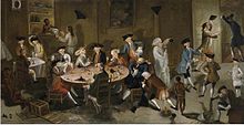 Cooke first became politically active at the age of 35, when he was elected as an Assistant from Providence in 1752, being elected again to this position three more times within seven years.[3] In the mid-1750s, the Boston portraitist, John Greenwood followed a group of sea captains and merchants to Surinam on the northeast coast of South America.[4] The trading usually took time, so the men often waited in pubs.[4] Being commissioned by the merchants to create a satirical painting, Greenwood concocted a 22-figure tavern scene, showing himself among the affluent traders, all subject to the "intoxicating effects of alcohol and economic ambition."[4] Different accounts agree that Cooke is the man wearing a hat, seated at the back of the table, facing right and smoking a pipe.[4][5]