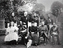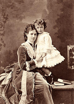 In his childhood, Nicholas, his parents and siblings made annual visits to the Danish royal palaces of Fredensborg and Bernstorff to visit his grandparents, the king and queen. The visits also served as family reunions, as his mother's siblings would also come from the United Kingdom, Germany and Greece with their respective families.[19] It was there in 1883, that he had a flirtation with one of his British first cousins, Princess Victoria. In 1873, Nicholas also accompanied his parents and younger brother, two-year-old George, on a two-month, semi-official visit to the United Kingdom.[20] In London, Nicholas and his family stayed at Marlborough House, as guests of his "Uncle Bertie" and "Aunt Alix", the Prince and Princess of Wales, where he was spoiled by his uncle.[21]