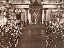Despite a visit to the United Kingdom in 1893, where he observed the House of Commons in debate and seemingly impressed by the machinery of constitutional monarchy, Nicholas turned his back on any notion of giving away any power to elected representatives in Russia. Shortly after he came to the throne, a deputation of peasants and workers from various towns' local assemblies (zemstvos) came to the Winter Palace proposing court reforms, such as the adoption of a constitutional monarchy,[41] and reform that would improve the political and economic life of the peasantry, in the Tver Address.[42][43]