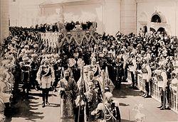 On 26 May 1896, Nicholas's formal coronation as Tsar was held in Uspensky Cathedral located within the Kremlin.[45]