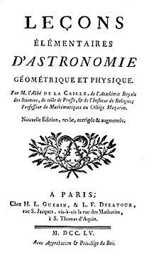 - ^ The traditional birth date of 15 March 1713 has been questioned due to many infants of the Catholic Church being baptised on the day of their birth in the 17th and 18th centuries. Thomas Hockey et al.: The Biographical Dictionary of Astronomers, Springer, 2007, ISBN 978-0-387-31022-0, p665; and his baptism date is 15 December 1713; babies were normally baptised on the day that they were born. Boquet, F. (1913). "Le Bicentenaire de Lacaille". L'Astronomie. 27: 457–473. Bibcode:1913LAstr..27..457B.. see page 459