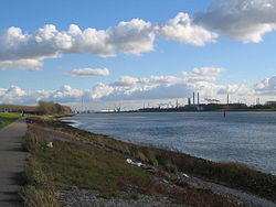 The Nieuwe Waterweg, which opened in 1872 and has a length of approximately 20.5 kilometres (12.7 mi), was constructed to keep the city and port of Rotterdam accessible to seafaring vessels as the natural Meuse-Rhine branches silted up.[1] The Waterway is a busy shipping route since it is the primary access to one of the busiest ports in the world, the Port of Rotterdam. At the entrance to the sea, a flood protection system called Maeslantkering has been installed (completed in 1997). There are no bridges or tunnels across the Nieuwe Waterweg.