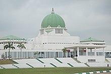 Nigeria is a federal republic modelled after the United States,[107] with executive power exercised by the President. It is influenced by the Westminster System model in the composition and management of the upper and lower houses of the bicameral legislature. The president is both head of state and head of the federal government; the leader is elected by popular vote to a maximum of two four-year terms.[108] The president's power is checked by a Senate and a House of Representatives, which are combined in a bicameral body called the National Assembly. The Senate is a 109-seat body with three members from each state and one from the capital region of Abuja; members are elected by popular vote to four-year terms. The House contains 360 seats, with the number of seats per state determined by population.[108]