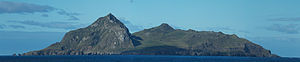 Nightingale has two peaks on its north end. One is 337 metres (1,106 ft) high[1] while the other is 293 metres (961 ft) high. The rest of the island is ringed by cliffs. However, these cliffs are not nearly as high as those surrounding Nightingale's neighbour Inaccessible Island, which is approximately 16 km away and has cliffs approximately 300m high. Thus human access is much easier on Nightingale than on Inaccessible. The island is a volcano, composed of early and late stage ash deposits. Massive Trachytic lava flows have been extruded in the past. Before 2004, the last eruption may have been over 39,000 years ago.