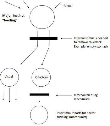 Tinbergen added complexity to this model, a model now known as Tinbergen's hierarchical model. He suggested that motivational impulses build up in nervous centres in the brain which are held in check by blocks. The blocks are removed by an innate releasing mechanism that allows the energy to flow to the next centre (each centre containing a block that needs to be removed) in a cascade until the behaviour is expressed. Tinbergen's model shows multiple levels of complexity and that related behaviours are grouped.[18]