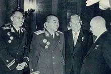 Nikolai Alexandrovich Bulganin (Russian: Никола́й Алекса́ндрович Булга́нин; 30 May [O.S. 17 May] 1895 – 24 February 1975)[1] was a Soviet politician who served as Minister of Defense (1953–1955) and Premier of the Soviet Union (1955–1958) under Nikita Khrushchev, following service in the Red Army and as defence minister under Joseph Stalin.