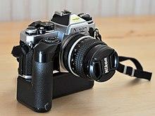 The Nikon FE is an advanced semi-professional level, interchangeable lens, 35 mm film, single-lens reflex (SLR) camera. It was manufactured by Nikon in Japan from 1978 to 1983, and was available new from dealer stock until c. 1984. The FE uses a metal-bladed, vertical-travel focal plane shutter with a speed range of 8 to 1/1000 second, plus Bulb, and flash X-sync of 1/125th second. It had dimensions of 89.5 millimetres (3.52 in) height, 142 mm (5.6 in) width, 57.5 mm (2.26 in) depth and 590 grams (21 oz) weight. It was available in two colors: black with chrome trim and all black. As on the FM, its model designation did not appear on the front of the camera, but was engraved as a small "FE" preceding the serial number on the rear of the housing.
