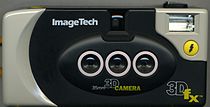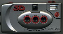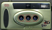 Several other three-lens cameras were released, such as the 3D wizard, 3D magic, 'DFX, and Kalimar, some of which sported more modern features such as built-in electronic flash and motorized film advance, but lacked the auto-exposure features of the Nimslo. The 3D trio featured 3 element coated glass lenses, built in flash, motorized film advance, automatic exposure control, compatibility with DX coded ASA 100, 200 and 400 film, and a built in protective lens cover, making it the closest three-lens equivalent to the Nimslo.[20] These 3 lens cameras gave more pictures per roll of film, 16 [21] for 24 exposure roll rather than the 12[22] yielded by Nimslo/Nishika and had less ghosting, but also less depth.[19] There were other four-lens Nimslo clones as well, such as the 3DNext and the Rittai.[23] Like the Nishika, several of these were marketed through multilevel schemes, often in Asian countries, occasionally being the basis of a scam.[6]
