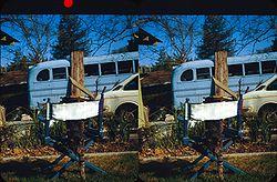 David Burder came up with more radical modifications. One, the original Burdlo, featured a modified lens board with two lenses but essentially the same film advance to take full-frame stereo pictures. The stereo base was greatly reduced to only 36mm, adequate for closeup work.[29] Other cameras also going by the name Burdlo included multiple Nimslos joined together to make 12 lens and 24 lens lenticular cameras. None of these were as popular as the Teco-Nimslo but pictures of them are easy enough to find on the web[30] and have occasionally been the subject of blog entries.[31]