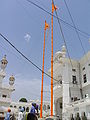 Traditional symbol of the Khalsa Panth (corps of initiated Sikhs), the Nishan Sahib can be seen from far away, signifying the presence of Khalsa in the neighbourhood. It is taken down every Baisakhi (harvest festival, mid-April in the Gregorian calendar and first in the Nanakshahi calendar), and replaced with a fresh flag, and the flagpole refurbished.