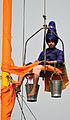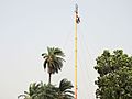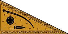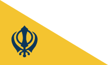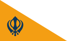 The Khanda, a Sikh symbol, today, is rendered in navy blue on the saffron background while the original was basanti( bright yellow) and surrmai neela ( Royal blue). The khanda is placed high up on a flagpole as a sign for all Sikhs and indeed any other people that they can come and pray in this building. Great respect is shown to this flag[2] and the flag is considered sacred and washed using milk and water every year[3] in April at the festival of Vaisakhi. The Nishan Sahib is changed once the saffron color has faded.