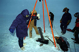 The sea temperature at the water sampling depth is recorded by means of a reversing thermometer fixed to the Nansen bottle. This is a mercury thermometer with a constriction in its capillary tube which, when the thermometer is inverted, causes the thread to break and trap the mercury, fixing the temperature reading.[1] Since water pressure at depth will compress the thermometer walls and affect the indicated temperature, the thermometer is protected by a rigid enclosure. A non-protected thermometer is paired with the protected one, and comparison of the two temperature readings allows both temperature and pressure at the sampling point to be determined.