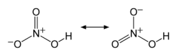 Two of the N–O bonds are equivalent and relatively short (this can be explained by theories of resonance; the canonical forms show double-bond character in these two bonds, causing them to be shorter than typical N–O bonds), and the third N–O bond is elongated because the O atom is also attached to a proton.[6][7]