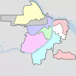 Nizhny Novgorod is divided by the Oka River into two distinct parts. The Upper City (Russian: Нагорная часть, Nagornaya chast, Mountainous part) is located on the hilly eastern (right) bank of the Oka. It includes three of the eight city districts into which the city is administratively divided: