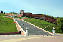 Top-down, left-to-right: Dmitrievskaya Tower of the Nizhny Novgorod Kremlin and Minin and Pozharsky Square, Alexander Nevsky Cathedral and Nizhny Novgorod Stadium, Minin and Pozharsky Monument, GAZ, Chkalov Stairs, Nizhny Novgorod Fair. | |