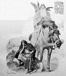 Parallels have been pointed out between Njörðr and the figure of Hadingus, attested in book I of Saxo Grammaticus' 13th century work Gesta Danorum.[38] Some of these similarities include that, in parallel to Skaði and Njörðr in Skáldskaparmál, Hadingus is chosen by his wife Ragnhild after selecting him from other men at a banquet by his lower legs, and, in parallel to Skaði and Njörðr in Gylfaginning, Hadingus complains in verse of his displeasure at his life away from the sea and how he is disturbed by the howls of wolves, while his wife Regnhild complains of life at the shore and states her annoyance at the screeching sea birds.[38] Georges Dumézil theorized that in the tale Hadingus passes through all three functions of his trifunctional hypothesis, before ending as an Odinic hero, paralleling Njörðr's passing from the Vanir to the Æsir in the Æsir-Vanir War.[39]