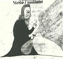 In chapter 14 of Saga of Hákon the Good a description of the pagan Germanic custom of Yule is given. Part of the description includes a series of toasts. The toasts begin with Odin's toasts, described as for victory and power for the king, followed by Njörðr and Freyr's toast, intended for good harvests and peace. Following this, a beaker is drank for the king, and then a toast is given for departed kin.[29] Chapter 28 quotes verse where the kenning "Njörðr-of-roller-horses" is used for "sailor".[30] In the Saga of Harald Graycloak, a stanza is given of a poem entitled Vellekla ("Lack of Gold") by the 10th century Icelandic skald Einarr skálaglamm that mentions Njörðr in a kenning for "warrior."[31]