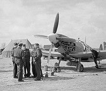 On 1 February 1944 Sqn Ldr Václav Bergman succeeded Fajtl as commanding officer.[4] Also in February the squadron was re-equipped with the Spitfire IX.[5] This model was fitted with 190-gallon "slipper" tanks to extend its range, enabling the squadron to escort bombers on raids deep into Germany.[8] On 20 February the squadron moved to RAF Mendlesham[7] in Suffolk. On 14 March it moved again, to RAF Rochford[7] in Essex.