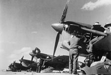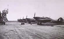 After being completely re-equipped with Spitfires in early 1944, No. 451 Squadron was transferred to Corsica and arrived there on 18 April, attached to No. 251 Wing RAF (with No. 237 Squadron RAF and No. 238 Squadron RAF). This move was very popular with the squadron's pilots as it gave them an opportunity to participate in offensive action.[14] The squadron's role was to support Allied operations in Italy and southern France by escorting bombers and conducting armed reconnaissance patrols.[15] It flew its first operation from Corsica on 23 April and engaged German fighters on a number of occasions. In mid-June the squadron supported the Free French-led Invasion of Elba.[15] On 12 June eight personnel were killed and all but two of No. 451 Squadron's Spitfires were damaged when 25 German Ju 88 bombers raided the unit's base at Poretta airfield. The squadron's ground crew were able to return ten Spitfires to service by the afternoon of 13 June, however.[16]