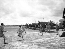 In January 1944, the squadron joined the Allies Second Tactical Air Force, attached to No. 125 Wing RAF (part of No. 83 Group RAF). Further moves occurred over subsequent months, as the squadron began to focus on ground attack sorties, in the lead up to the Allied invasion of North West Europe. Soon after D-Day, the squadron moved to France,[15] where it operated from the hastily constructed landing ground B11 at Longues-sur-Mer, close to the front line. On 16 June, a large-scale dogfight was fought with 12 Messerschmitt Bf 109s over Caen, during which several were shot down.[15] As the Allies advanced, the squadron moved forward so that it could continue to provide close support to the ground troops. This continued until September 1944 when the squadron was withdrawn back to the United Kingdom. From November 1944 to March 1945, No. 453 Squadron was heavily engaged in striking at assembly and launch sites used by the Germans in their V-1 and V-2 rocket attacks against Britain.[3]