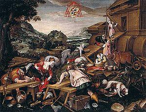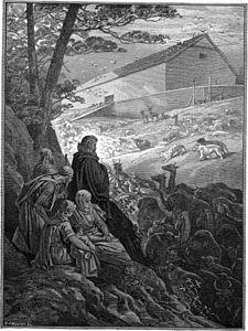 A Tanna read the words, "with lower, second, and third stories shall you make it," in Genesis 6:16 to teach that the bottom story was for the dung, the middle for the animals, and the top for Noah's family.[89] A Midrash, however, reported that some said that the words, "with lower, second, and third stories shall you make it," meant that the bottom story was for waste, the second for Noah's family and the clean animals, and the third for the unclean animals. And the Midrash reported that others said that the bottom story was for the unclean animals, the second for Noah's family and the clean animals, and the top for the garbage. The Midrash taught that Noah managed to move the waste by arranging a kind of trapdoor through which he shoveled it sideways.[93]