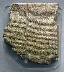 Tablet 11 of the Epic of Gilgamesh, composed in Mesopotamia in the 14th to 11th centuries BCE, presents a parallel flood story to that in Parashah Noach.[67] Professor John J. Collins of Yale Divinity School reported that the flood story that came to be part of the Epic of Gilgamesh appears to have previously been an independent tale in Sumerian.[68] Professor Gary Rendsburg of Rutgers University notes these similarities and differences:[69]