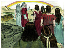 In the fifth reading (עליה, aliyah), God made a covenant with Noah, his sons, and every living thing that never again would a flood destroy the earth.[33] God set the rainbow in the clouds as the sign of God's covenant with earth, so that when the bow appeared in the clouds, God would remember God's covenant and the waters would never again flood to destroy all flesh.[34] The fifth reading (עליה, aliyah) and the first open portion (פתוחה, petuchah) end here.[35]