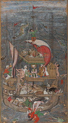 A story involving Lord Vishnu and King Sraddhadeva Manu (a.k.a. Vaivasvata Manu) is found in the Hindu chronicle Matsya Purana. Lord Vishnu in his 'matsya' (fish) avatar ordered the virtuous king Manu to construct a huge boat with animal and plant specimens of all forms, to escape the Great Deluge, and finally when the water receded, the great boat was found atop the Malaya Mountains.[46] Encyclopædia Britannica notes that "Manu combines the characteristics of the Hebrew Bible figures of Noah, who preserved life from extinction in a great flood, and Adam, the first man",[47] which view is reflected in several other works.[48] Indologist David Dean Shulman writes that borrowing between the myths of Manu and Noah "cannot be ruled out".[49] For Krishna Mohan Banerjee, the names "Noah" and "Manu" "had the same etymological root: 'Manu' must have been the Indo-Aryan ideal of Noah."[50] Philologist and founder of the Asiatic Society of Bengal, William Jones, "identifies Manu with Noah", along with whom, "the seven sages can be identified with the eight people aboard the Ark."[51] Furthermore, researcher Klaus Klostermaier reports a Muslim writer who "identifies Brahma with Abraham .... and Manu with Noah."[52] Others, however, would say that "the story is thoroughly Indian" and the "boat is not the equivalent of Noah's Ark, though it is still the symbol of salvation"[53] According to Hindu texts such as the Manusmriti and Puranas, Manu's story occurred at the beginning of the present manvantara, which is the 7th manvantara and Manu.[54] This amounts to about 120.53 million years ago (see Hindu units of time).[55][56][57]