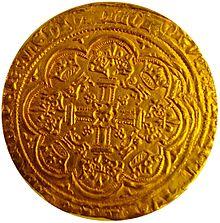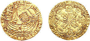 Edward III Second Coinage obverse legend: EDWAR DGRA REX ANGL Z FRANC DNS HYB ("Edward by the grace of God King of England and France Lord of Ireland"). Design: The king, holding a sword and shield in a ship. Reverse legend: IHC AUTEM TRANSIENS PER MEDIUM ILLORUM IBAT ("But Jesus passing through their midst went His way"). Design: 'L' in centre of a cross. The image of the ship and the Biblical text (from the Gospel of Luke 4:30) commemorate Edward's victory at the Battle of Sluys in 1340.[1]