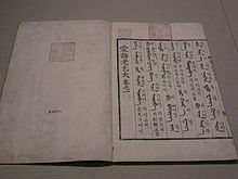 Translations of the Nogeoldae into other languages were also published by the Bureau of Interpreters. The Cheong-eo Nogeoldae (淸語老乞大 "Manchu 'Old Cathayan'") includes Manchu text along with Hangul pronunciation and Korean translations. It was written by Choe Hutaek (崔厚澤) and others and published in 1704 and revised in 1765. I Choedae (李最大) made a Mongolian edition called the Mong-eo Nogeoldae (蒙語老乞大 "Mongolian 'Old Cathayan'") that was published in 1741 and revised in 1766 and 1790.[15] A Japanese translation was also published, but is no longer extant.[16]