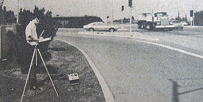 Noise barriers have been built in the United States since the mid-twentieth century, when vehicular traffic burgeoned. I-680 in Milpitas, California was the first noise barrier.[1] In the late 1960s, analytic acoustical technology emerged to mathematically evaluate the efficacy of a noise barrier design adjacent to a specific roadway. By the 1990s, noise barriers that included use of transparent materials were being designed in Denmark and other western European countries.[2] Below, a researcher collects data to calibrate a roadway noise model for Foothill Expressway.