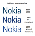 In March 2011, Nokia introduced a new corporate typeface called "Pure".[106] On 1 August 2011, Nokia announced that it would adopt a new three-digit naming system for mobile phone products and stop using letters, effectively ending the Nseries, Eseries, and short-lived Cseries. That same day the Nokia 500 was introduced with the new system.[107] Nokia last used three-digit names on analogue phones in the 1990s.[79]