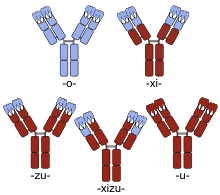 These non-human antibodies are recognized as foreign by the human immune system and may be rapidly cleared from the body, provoke an allergic reaction, or both.[12][13] To avoid this, parts of the antibody can be replaced with human amino acid sequences, or pure human antibodies can be engineered. If the constant region is replaced with the human form, the antibody is termed chimeric and the substem used was -xi-. Part of the variable regions may also be substituted, in which case it is called humanized and -zu- was used; typically, everything is replaced except the complementarity-determining regions (CDRs), the three loops of amino acid sequences at the outside of each variable region that bind to the target structure, although some other residues may have to remain non-human in order to achieve good binding. Partly chimeric and partly humanized antibodies used -xizu-. These three substems did not indicate the foreign species used for production. Thus, the human/mouse chimeric antibody basiliximab ends in -ximab just as does the human/macaque antibody gomiliximab. Purely human antibodies used -u-.[2]