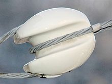 Guy wires supporting antenna masts usually have strain insulators inserted in the cable run, to keep the high voltages on the antenna from short circuiting to ground or creating a shock hazard. Often guy cables have several insulators, placed to break up the cable into lengths that prevent unwanted electrical resonances in the guy. These insulators are usually ceramic and cylindrical or egg-shaped (see picture). This construction has the advantage that the ceramic is under compression rather than tension, so it can withstand greater load, and that if the insulator breaks, the cable ends are still linked.