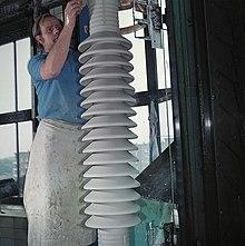Insulators used for high-voltage power transmission are made from glass, porcelain or composite polymer materials. Porcelain insulators are made from clay, quartz or alumina and feldspar, and are covered with a smooth glaze to shed water. Insulators made from porcelain rich in alumina are used where high mechanical strength is a criterion. Porcelain has a dielectric strength of about 4–10 kV/mm.[6] Glass has a higher dielectric strength, but it attracts condensation and the thick irregular shapes needed for insulators are difficult to cast without internal strains.[7] Some insulator manufacturers stopped making glass insulators in the late 1960s, switching to ceramic materials.