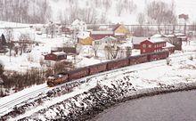 During the 1960s the passenger trains were up to fourteen cars long, and would have to be hauled by two locomotives.[99] Freight traffic increased beyond expectations with the opening of the Bodø extension. A direct freight train service from Oslo to Bodø was introduced in 1977, cutting travel time to 21 hours. It was mostly used for containers, which could then be transshipped to a north-bound ship service. Transport time to Tromsø was thus cut by 24 hours. Fauske received a container terminal two years later.[100]