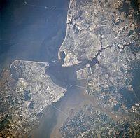 In the first half of the twentieth century, the city of Norfolk expanded its borders through annexation. In 1906, the city annexed the incorporated town of Berkley, making the city cross the Elizabeth River.[20] In 1923, the city expanded to include Sewell's Point, Willoughby Spit, the town of Campostella, and the Ocean View area. The city included the Navy Base and miles of beach property fronting on Hampton Roads and the Chesapeake Bay.[21] After a smaller annexation in 1959, and a 1988 land swap with Virginia Beach, the city assumed its current boundaries.[22]