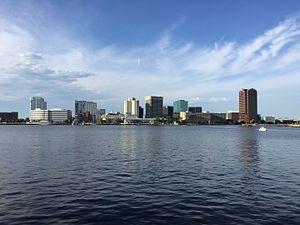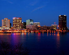 Norfolk's city leaders began a long push to revive its urban core. While Granby Street underwent decline, Norfolk city leaders focused on the waterfront and its collection of decaying piers and warehouses. Many obsolete shipping and warehousing facilities were demolished. In their place, planners created a new boulevard, Waterside Drive, along which many of the high-rise buildings in Norfolk's skyline have been erected. In 1983, the city and The Rouse Company developed the Waterside festival marketplace to attract people back to the waterfront and catalyze further downtown redevelopment.[30] Waterside was redeveloped in 2017. Additionally the waterfront area hosts the Nauticus maritime museum and the USS Wisconsin. Other facilities opened in the ensuing years, including the Harbor Park baseball stadium, home of the Norfolk Tides Triple-A minor league baseball team. In 1995, the park was named the finest facility in minor league baseball by Baseball America.[31] Norfolk's efforts to revitalize its downtown have attracted acclaim from economic development and urban planning circles throughout the country. Downtown's rising fortunes helped to expand the city's revenues and allowed the city to direct attention to other neighborhoods.[32]
