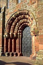 The Norman arch is a defining point of Norman architecture. Grand archways are designed to evoke feelings of awe and are very commonly seen as the entrance to large religious buildings such as cathedrals. Norman arches are semicircular in form. Early examples have plain, square edges; later ones are often enriched with the zig-zag and roll mouldings. The arches are supported on massive columns, generally plain and cylindrical, sometimes with spiral decoration; occasionally, square-section piers are found. Main doorways have a succession of receding semicircular arches, often decorated with mouldings, typically of chevron or zig-zag design; sometimes there is a tympanum at the back of the head of the arch, which may feature sculpture representing a Biblical scene. Norman windows are mostly small and narrow, generally of a single round-headed light; but sometimes, especially in a bell tower, divided by a shaft into two lights.[3]
